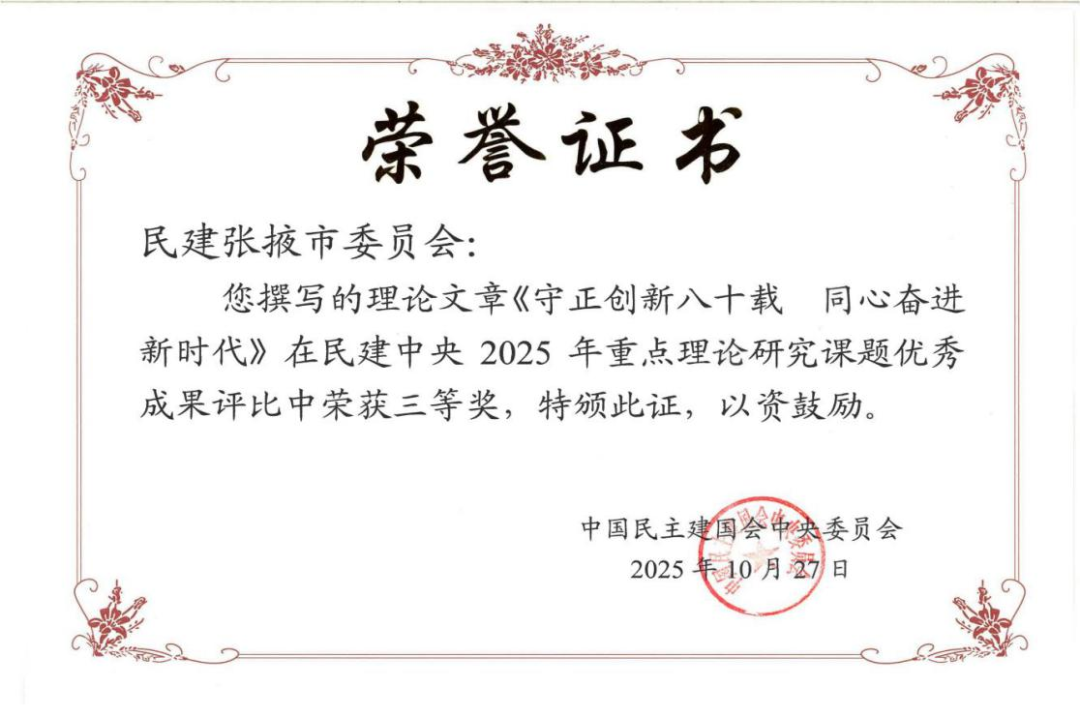 荣誉催人奋进,使命重任在肩。下一步,民建张掖市委会将以此为契机,持续巩固拓展主题教育成果,不断加强自身建设,围绕中心、服务大局,着力提升参政议政、民主监督和政治协商能力,在思想政治引领上持续深化,理论研究上精益求精,社会服务上提质增效,为推动张掖经济社会高质量发展凝聚智慧、汇聚力量。