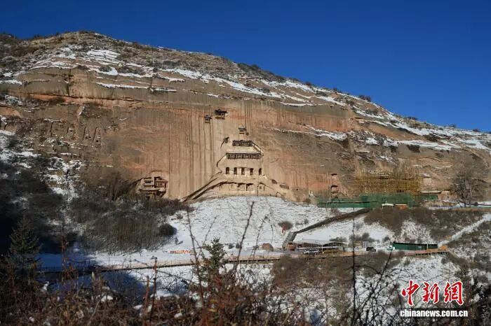 图为崖壁上的千年石窟在白雪映衬下更显古朴沧桑。戴文昌 摄
