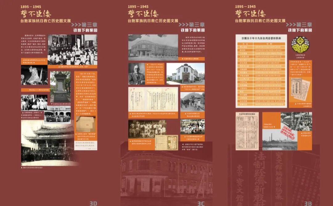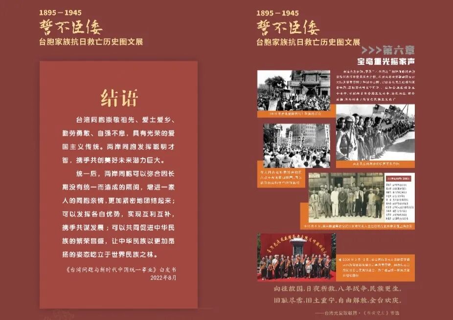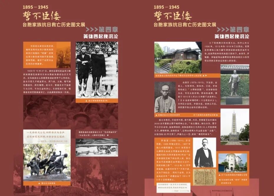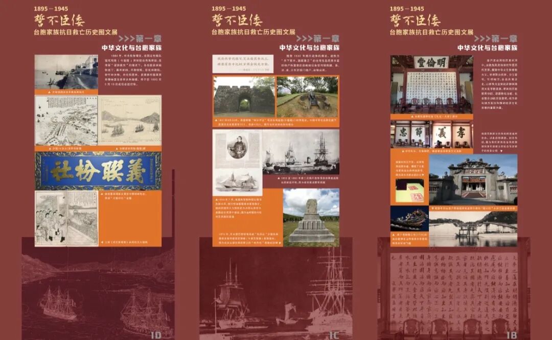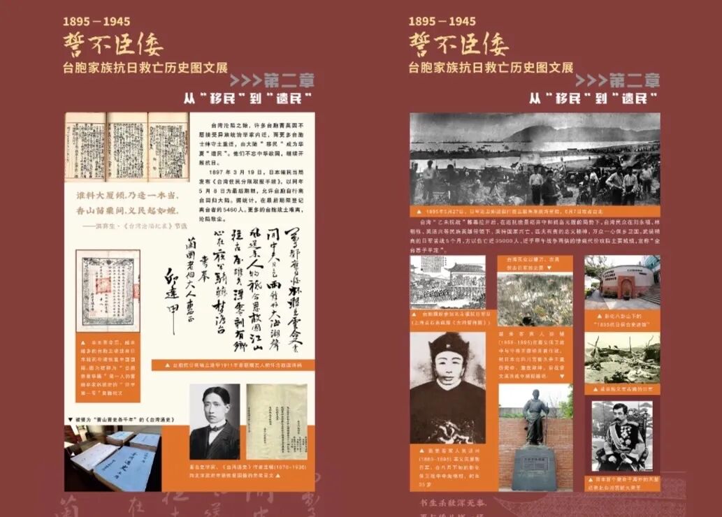 本次展览分“中华文化与台胞家族”“从‘移民’到‘遗民’”“铁蹄下的家园”“英雄四起挽沉沦”“并肩抗日洪波曲”“宝岛重光振家声”六个篇章,系统呈现了1895年至1945年间广大台湾同胞在民族精神感召下,不畏强暴、团结抗敌,自发组织义军英勇抗击外来侵略,最终迎来台湾光复的光辉历程。展览深刻揭示了台湾自古以来就是中国不可分割的一部分,彰显了两岸同胞休戚与共、并肩奋斗的民族情怀和命运共同体的真实历史。